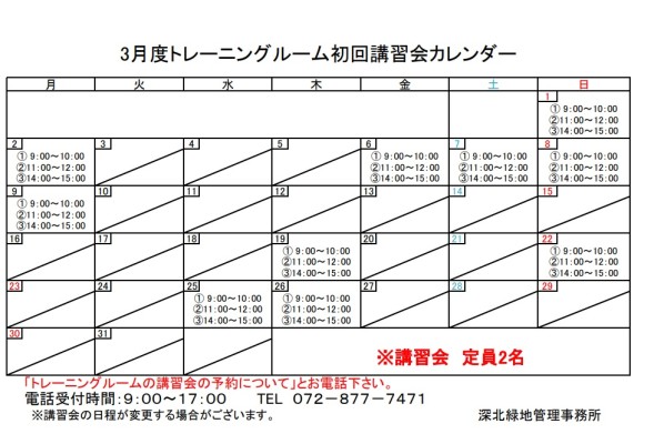 「トレーニングルームの講習会について」とお電話下さい。